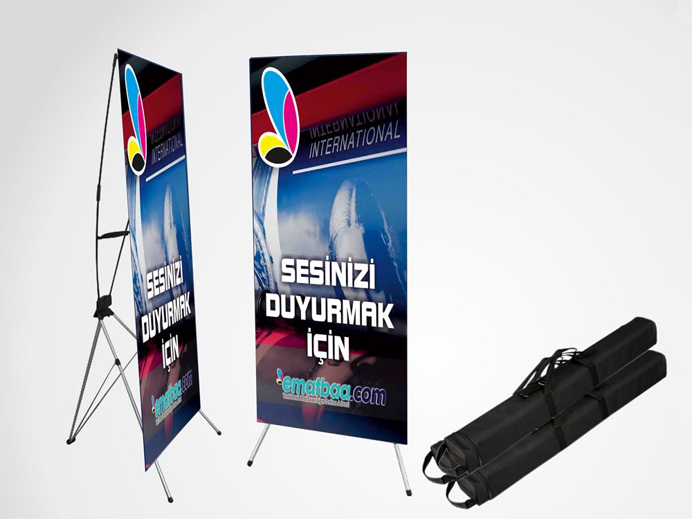 Görsel alanı 60 x 160 cm ölçüsünde özel malzemeye basılıp, mekanizmasına raptedilerek hazırlanır. Beraberindeki taşıma çantası içerisine yerleştirilerek gönderilmeye hazır hale getirilir. İskelet açık hali X şeklindedir L banner'a göre daha fazla taban alanına ihtiyaç duyar.