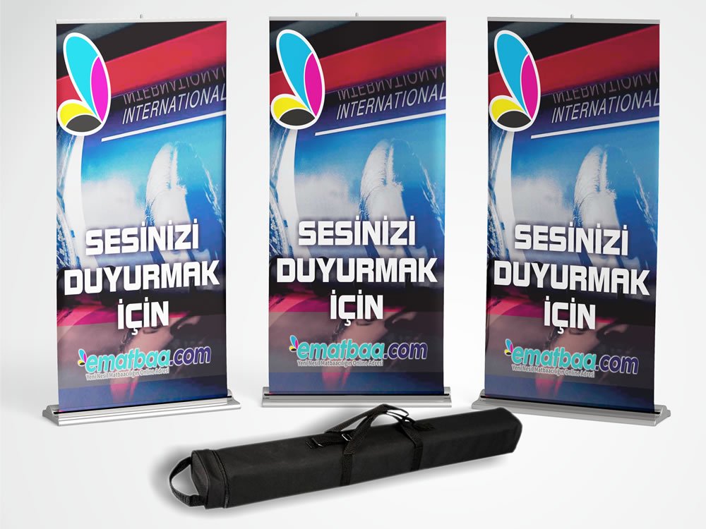 • Görsel alanı 85 x 200 cm ölçüsünde özel malzemeye basılıp, yaylı ve kendi içerisine saran mekanizmasına raptedilerek hazırlanır. Beraberindeki taşıma çantası içerisine yerleştirilerek gönderilmeye hazır hale getirilir.