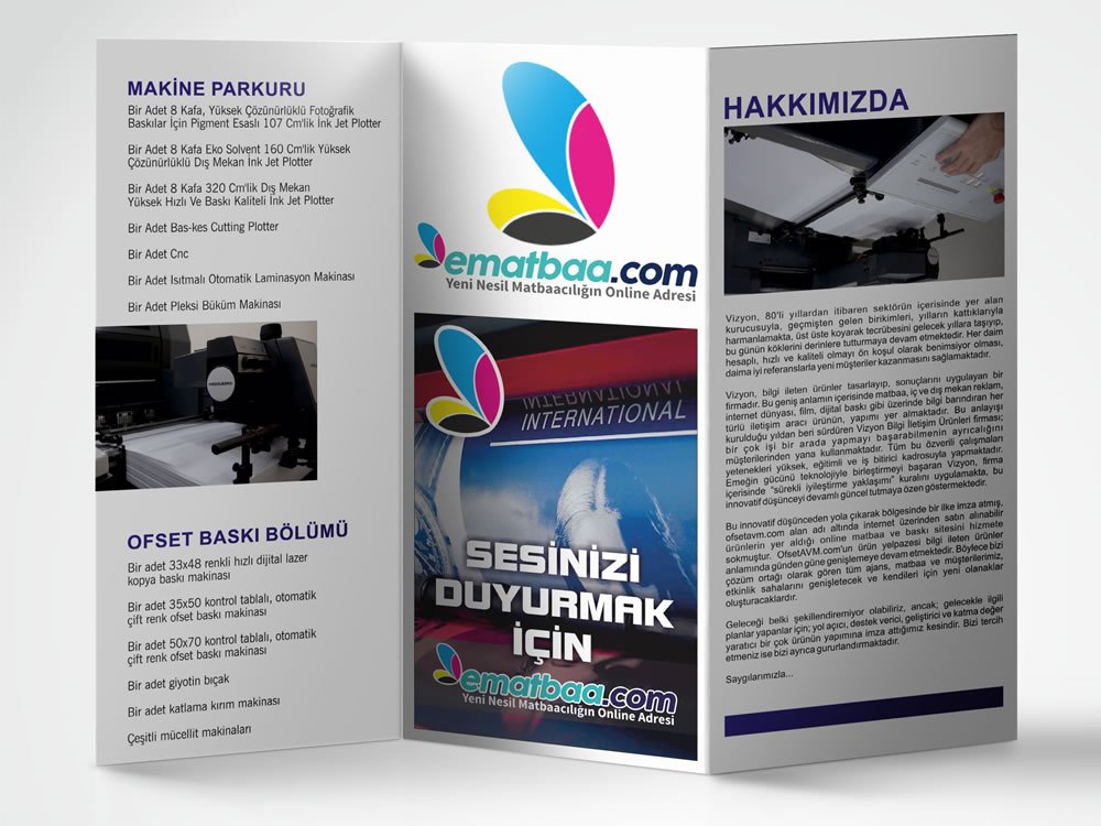 Kırımları dolayısıyla katlanabilen, katlanmış haliyle kullanılabilen broşürünüzün grafiği hazırsa; geriye sadece bize göndermeniz kalıyor. Hemen yükleyin, basıp size gönderelim...